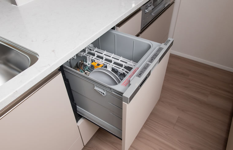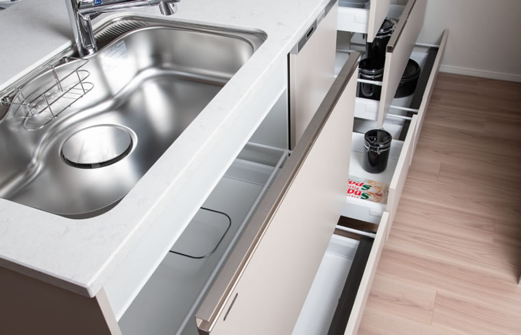 後片付けの手間を減らせ、食器の出し入れも楽な姿勢で行えるスライドオープンタイプの食器洗い乾燥機を採用しています。
