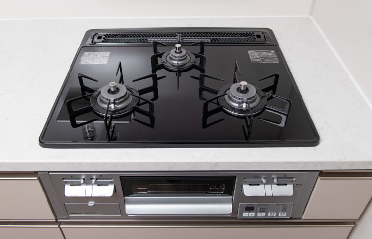 温度調整機能とダブル高火力&ダブルトロ火機能を搭載した3口ガスコンロを採用。3口なので効率的な調理が可能です。