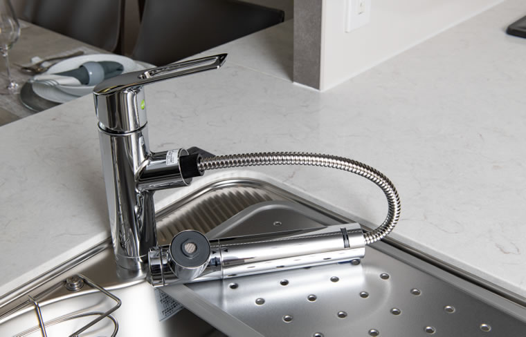 レバーひとつで浄水と水道水の切り替えが可能。シャワーヘッドを引き出して、シンクのすみずみまで洗えます。