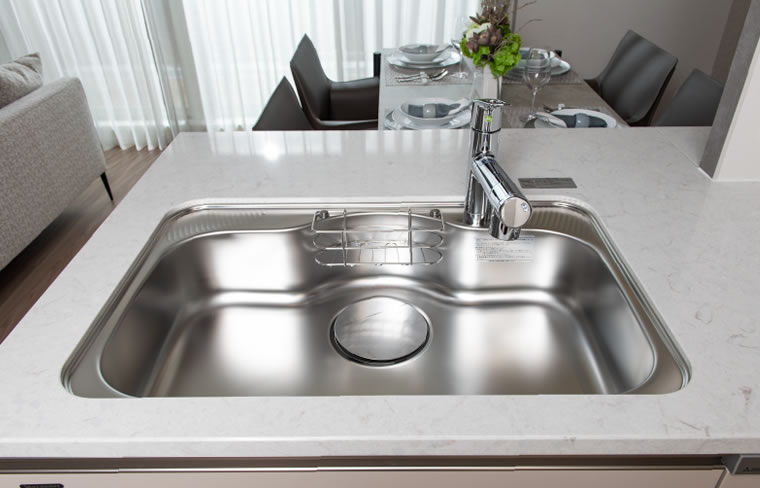 大きな鍋もゆったり洗えるシンクは、シンク制振材の効果によりシンクの水ハネの音を軽減します。