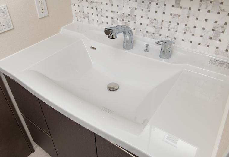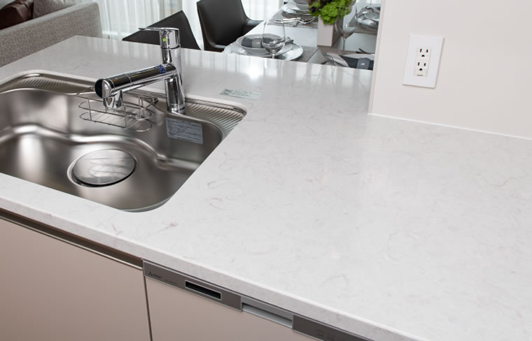 汚れにくくキズつきにくい人造大理石一体型カウンターを採用しました。上質な素材感で、お手入れも簡単です。