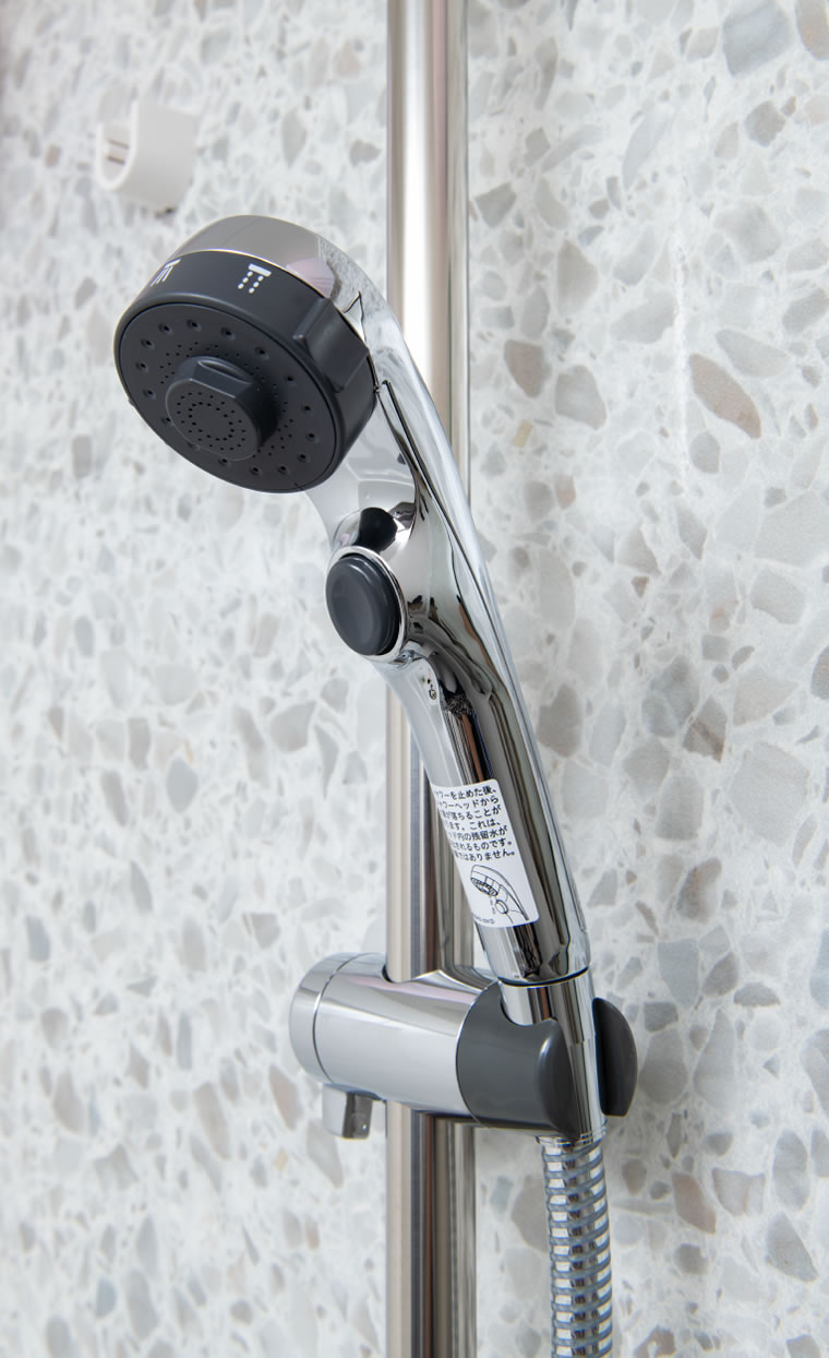 簡単に操作できる止水スイッチを備えたシャワー。節水効果が高く、省エネにも有効です。