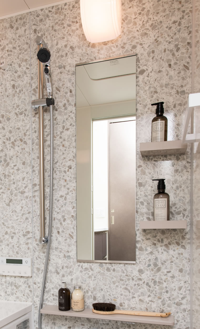 明るくてスッキリしたバスルームを演出する、ロングタイプの縦長ミラーを採用しています。