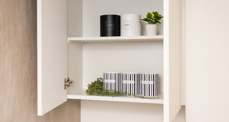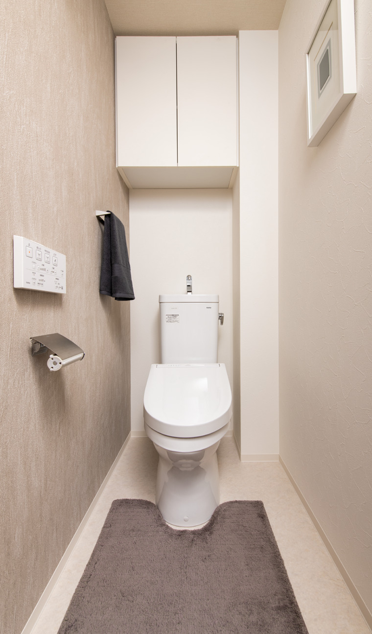 トイレ内を有効に使える吊戸棚タイプの収納スペース。トイレットペーパーなどをすっきりと収納できます。