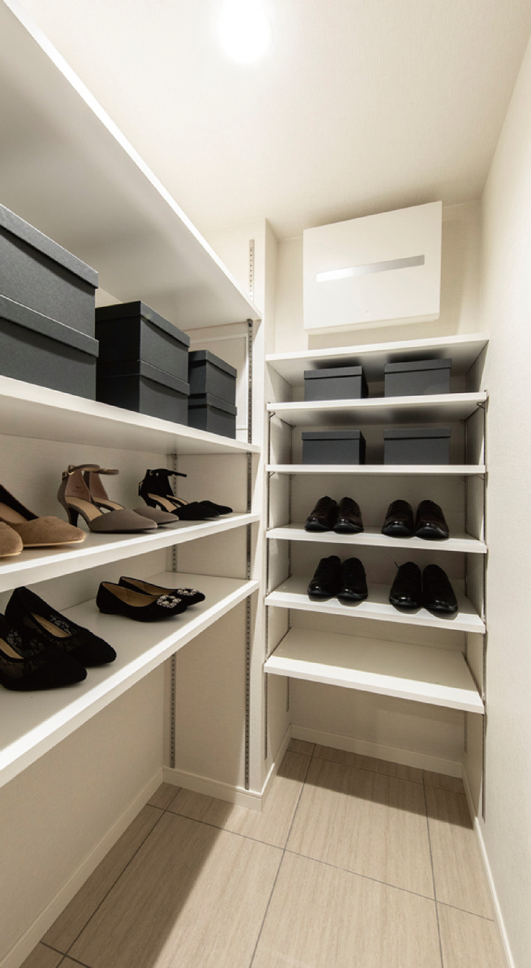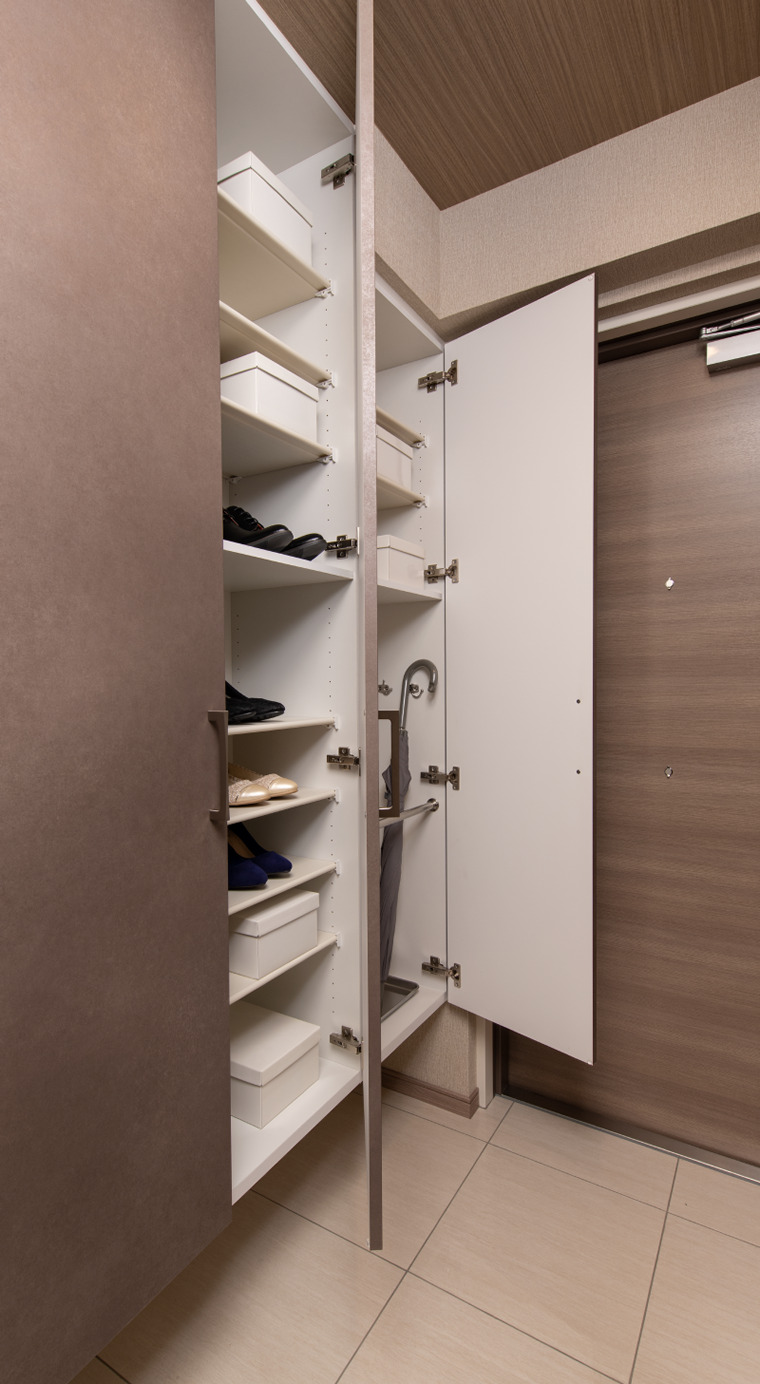 可動棚によりブーツなどもすっきり収納できる機能的なトールタイプのシューズボックスを採用しています。※一部タイプ除く。※タイプにより仕様が異なります。