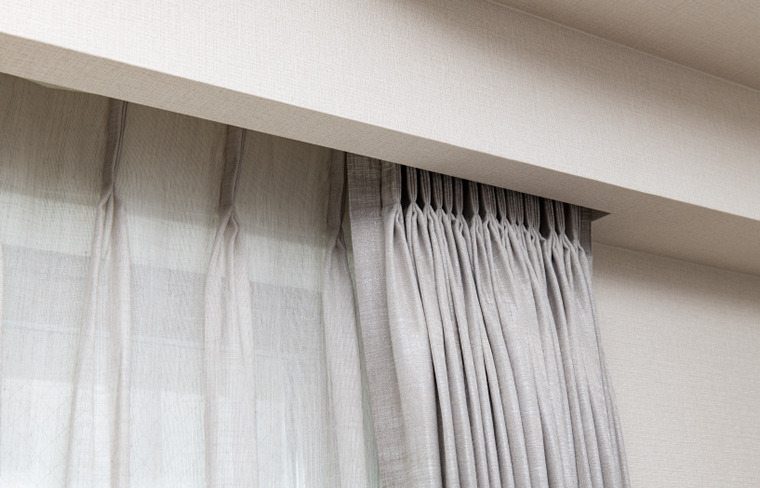 カーテンレールをさりげなく隠し、窓辺を美しく演出するカーテンボックスをリビング・ダイニングに設けました。