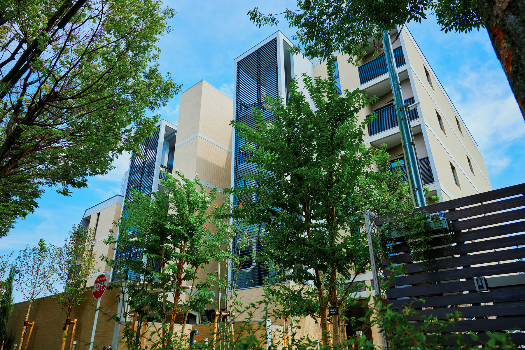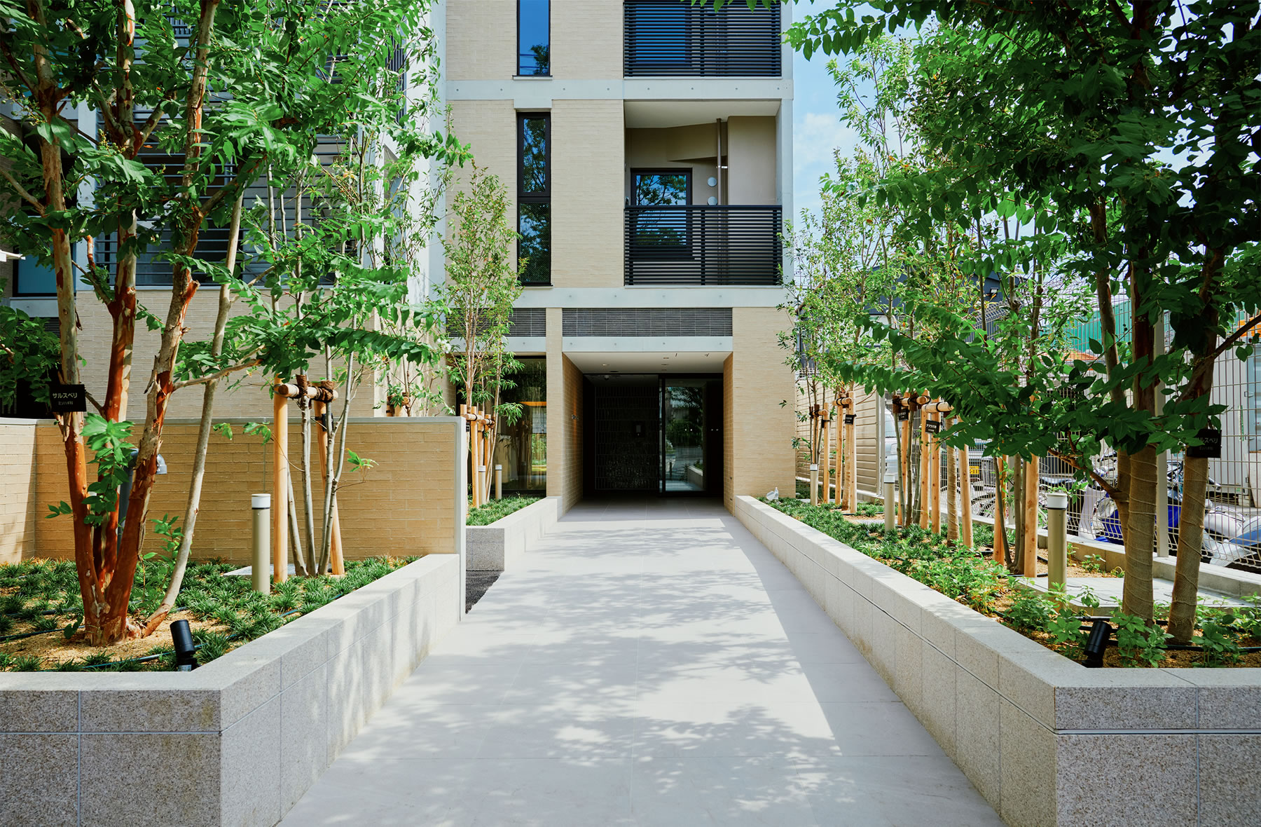 目の前の欅並木からのつながりを表現したエントランスアプローチ。