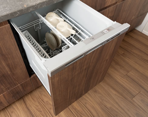 上から楽な姿勢で食器を出し入れできる、スライドオープンタイプの食器洗い乾燥機。約6人分をセットでき、隅々まで均等に洗浄します。