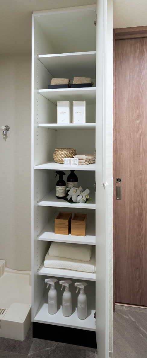 タオル類の整理や水廻り用品のストックなどに便利な収納を設置しました。※タイプにより仕様が異なります。