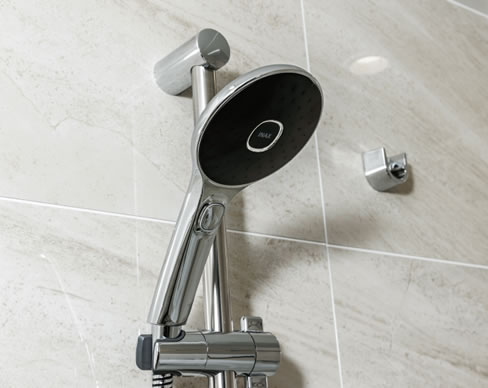 散水板の穴の大きさや位置の工夫と、水滴にたっぷりの空気を含ませることでボリュームのある浴び心地と節水を両立しました。