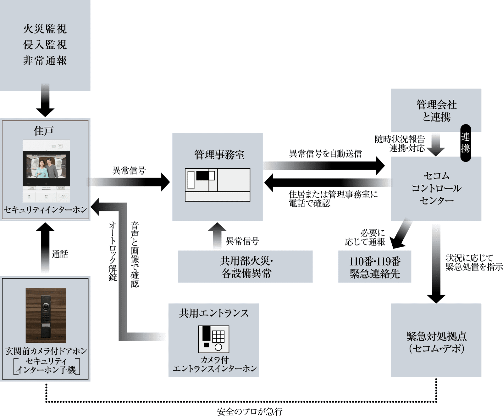 万一、各邸の玄関ドア・窓に設置された防犯(マグネット)センサーが非常事態を感知した場合、またはリビングのセキュリティインターホンに内蔵されている非常ボタンを押した場合、電話回線を通じてセコム・コントロールセンターへ自動通報。管理スタッフが不在でもオンラインで直結し、安全のプロが迅速に対応。必要に応じて警察・消防などに連絡します。