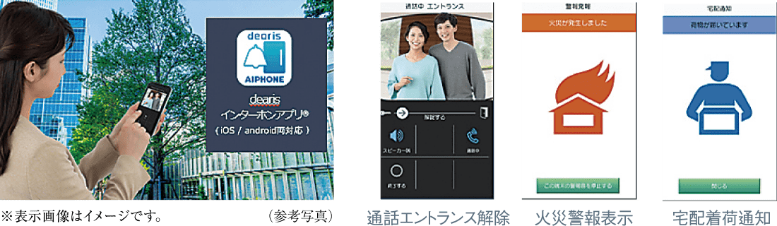 ●dearisインターホンアプリ®を使用するには、動作確認済みの無線LAN対応ルーターと、対応OSを搭載したスマートフォンまたはタブレットが必要です。●動作確認済みの無線LAN対応ルーター、スマートフォンなどの機種、最新の対応OSは当社ホームページ(https://www.aiphone.co.jp/)でご確認ください。●AndroidはGoogle LLCの商標または登録商標です。●iOSは、Apple Inc.のOS名称です。iOSは、Cisco Systems,Inc.またはその関連会社の米国およびその他の国における商標または登録商標であり、ライセンスに基づき使用されています。●ネットワーク環境によっては使用できない場合があります。●ネットワーク環境やスマートフォンなどの性能により、音声の途切れや画像取得が遅延する場合があります。●スマートフォンなどでの音声と映像はリップシンクしません。●スマートフォン同士での内線呼出/通話はできません。●住宅情報盤1台に登録できるスマートフォンなどは8台までです。