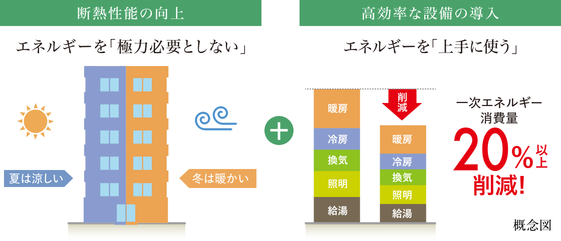 ZEH-M Oriented(ゼッチ・マンション オリエンテッド)は、建物の外皮断熱性能の向上と高効率の省エネ設備等の導入により、住棟全体で年間の一次エネルギー消費量を20%以上削減※することを目指すマンションです。