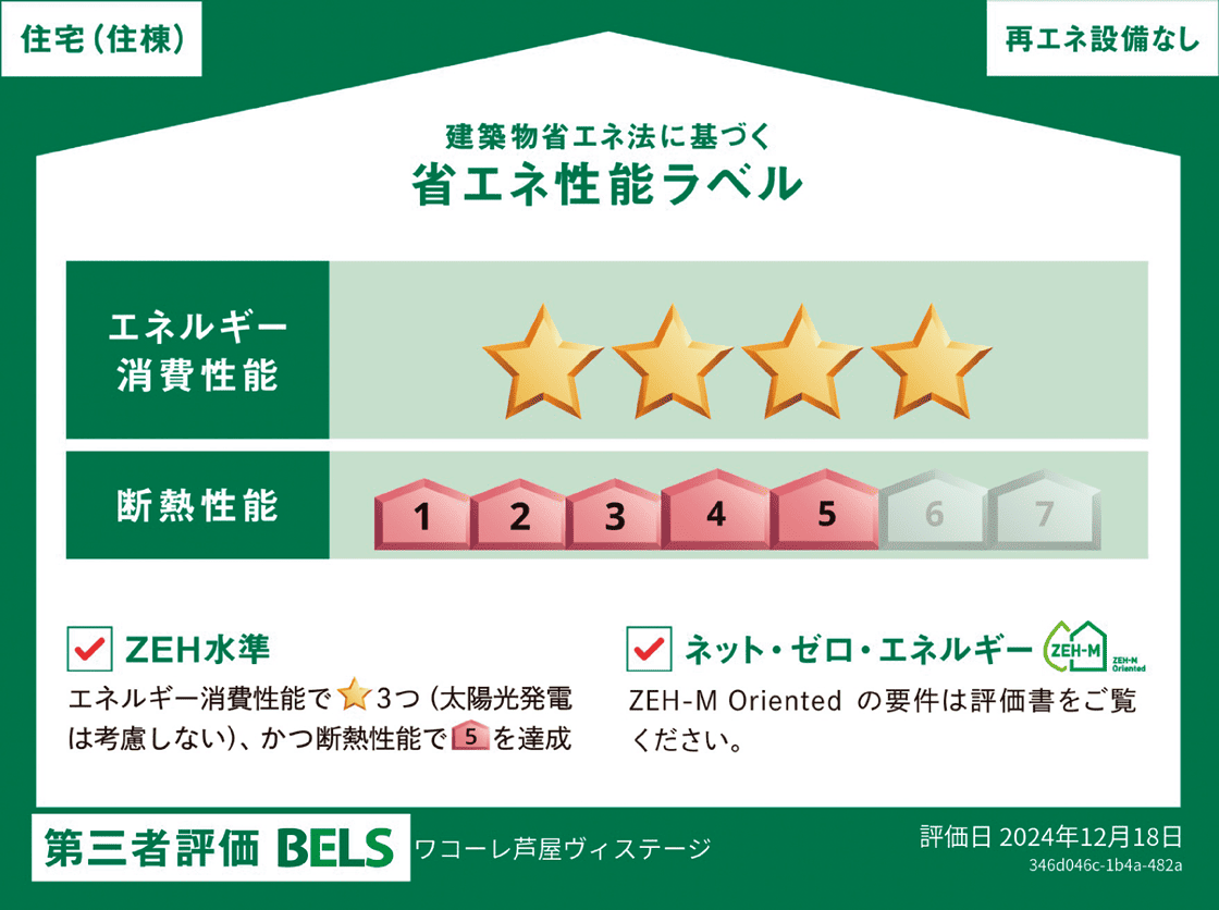 「ワコーレ芦屋ヴィステージ」は省エネ性能表示制度に基づく「省エネ性能ラベル」を住棟で取得しています。ラベルの取得に際しては、評価の客観性と信頼性を確保するために第三者評価制度BELSを利用しています。