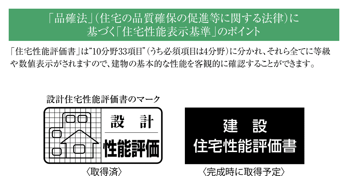 マンションの性能を客観的に確認できる住宅性能表示制度に基づき、設計は「設計住宅性能評価書」を取得したほか、建物完成後には「建設住宅性能評価書」を取得する予定です。(2025年3月現在)