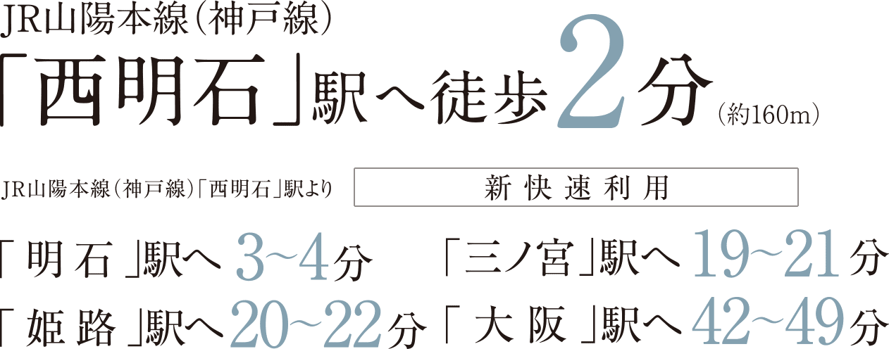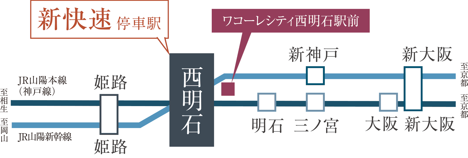 「西明石」駅は、新快速と新幹線それぞれの停車駅。JR神戸線の全39駅においてわずか2駅のみの希少性を誇っています。