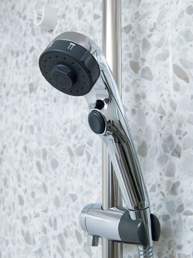簡単に操作できる止水スイッチを備えたシャワー。節水効果が高く、省エネにも有効です。