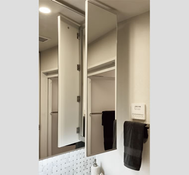 細かいメイクのチェックに便利なせり出すタイプのミラーを設置した三面鏡を採用。ミラー裏面が収納棚になっており、豊富な収納力も魅力です。