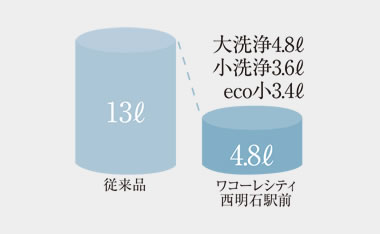 環境にやさしく、しかも経済的。洗浄使用量は大4.8ℓ/小3.6ℓ/eco小3.4ℓと従来品に比べ約70%の節水を実現。水道料金を節約できます。