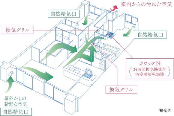 各居室等(一部除く)に設けられた自然給気口から外部の新鮮な空気を取り入れ、汚れた空気や二酸化炭素、湿気などを排出する24時間換気システムを採用。浴室暖房乾燥機を利用したシステムで、少風量の空気の流れを住まいの中につくり、健康的な室内環境を演出します。