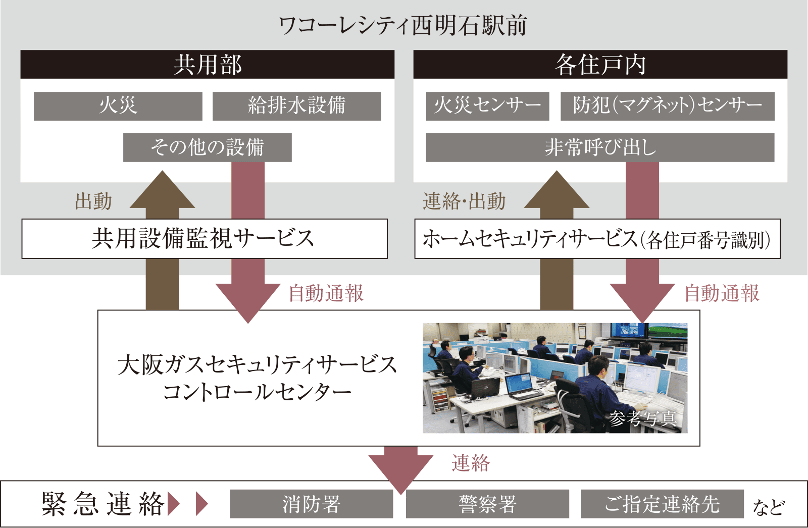 大阪ガスセキュリティサービスと連動した防犯(マグネット)センサーを設置。留守時などの不法侵入に対応します。※全住戸の玄関および2階住戸の開口部に設置。(FIX窓、面格子設置窓、縦すべり窓を除く。)