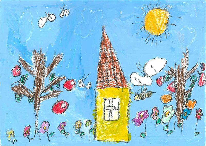 寺村 彩雪(5歳) ●コメント:たくさんの鳥や猫、家族と一緒に住む家で、半分は海の上に建てられています。ポイントは“にじ”。家のそばに立つ木には、にじ色の鳥の巣があり、卵もあります。本人ふくめ家族は、買い物に出ているため留守だそうです。 |