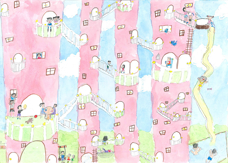 大串 瑠海(6年生) ●コメント:私は今マンションに住んでいて、マンションで過ごしている時にまどから宇宙が見えたらいいなと思いました。このエコマンションは移動中のエレベーターでも宇宙が見え、このマンションの電気は太陽光でとってもエコです!!私はこんなマンションがあったらいいな。と思いました。 |