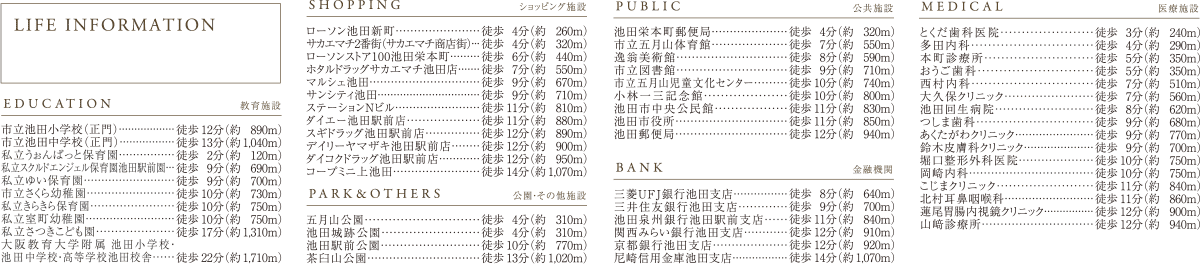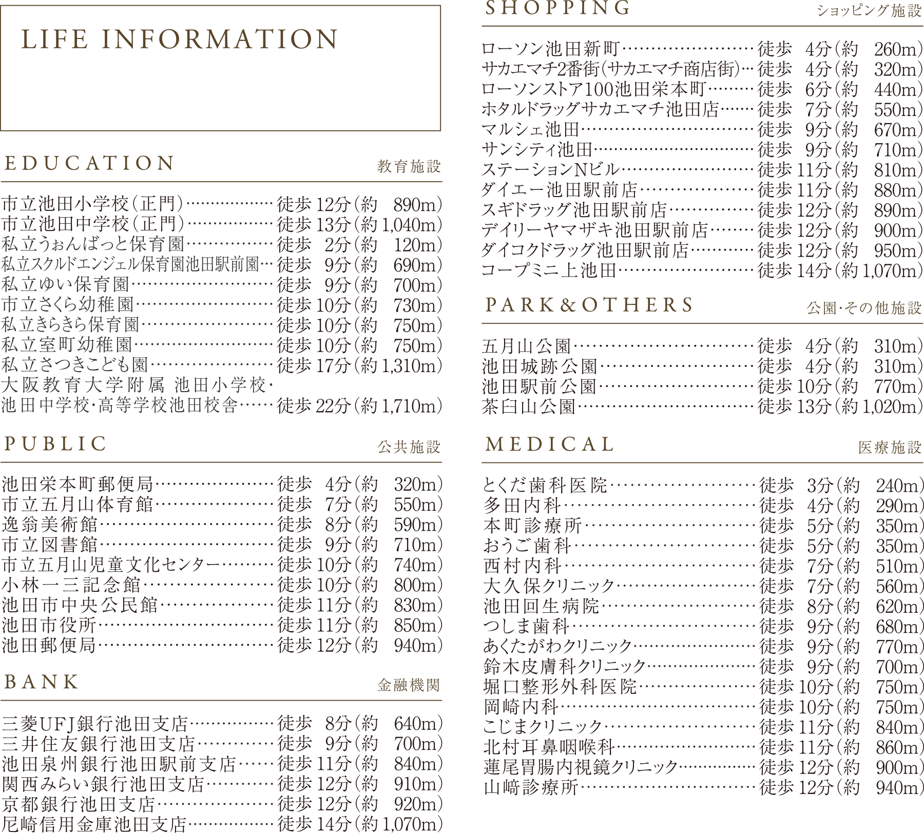 阪急「池田」駅直結の「マルシェ池田」などが身近に利用できる便利な環境です。