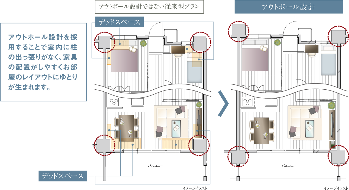 住まいの四隅から柱型の出っ張りをなくし広々した空間を実現。