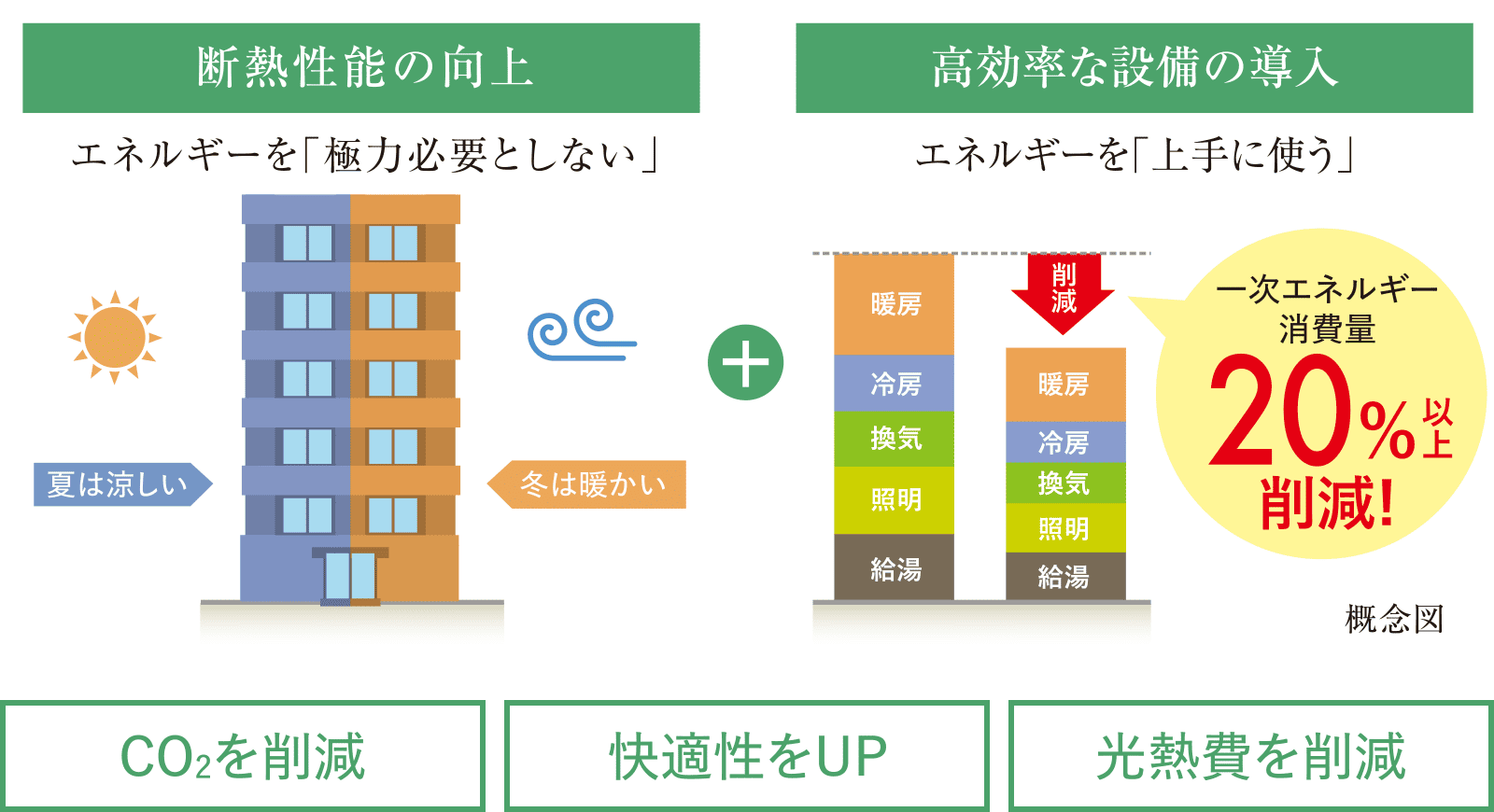 建物の外皮断熱性能の向上と高効率の省エネ設備等の導入により、