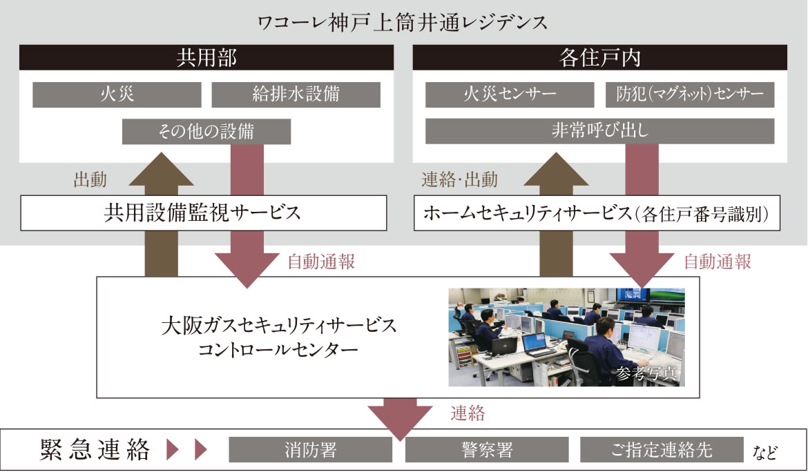 住戸の玄関と1階・5階住戸の開口部には大阪ガスセキュリティサービスと連動した防犯(マグネット)センサーを設置。留守時などの不法侵入に対応します。※FIX窓・バスルーム窓・面格子付窓を除く。