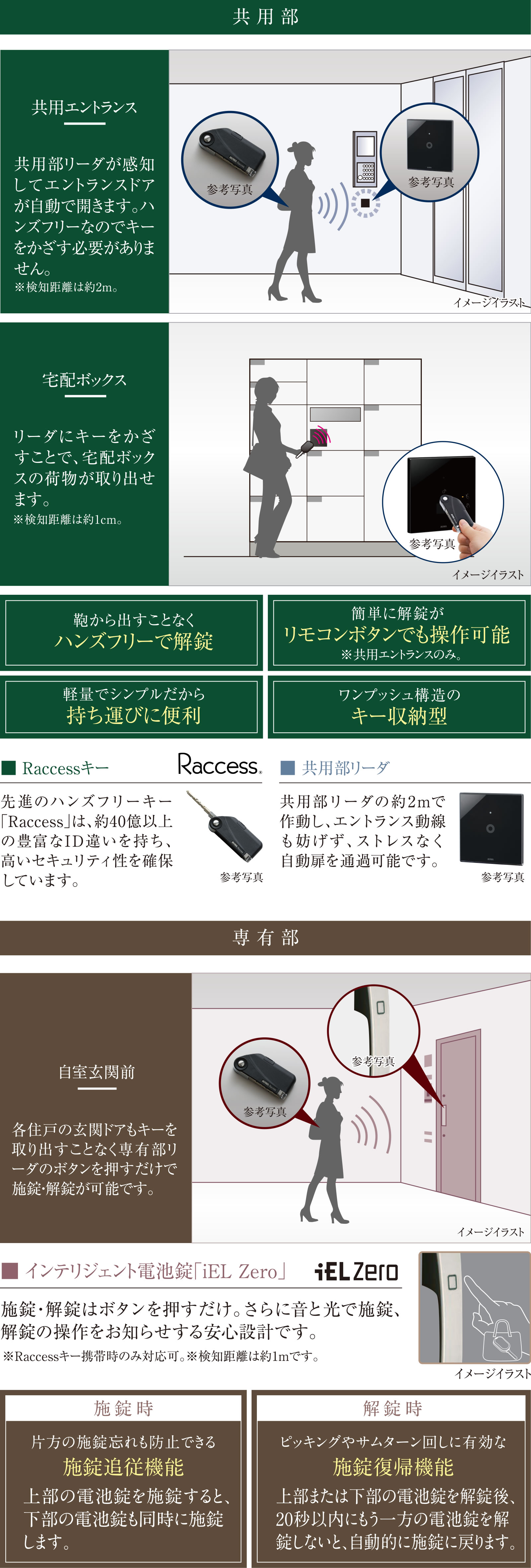 各邸の玄関ドアもキーを携帯したままリーダのボタンを押すだけ。高いセキュリティ性と快適性を両立した先進システムです。