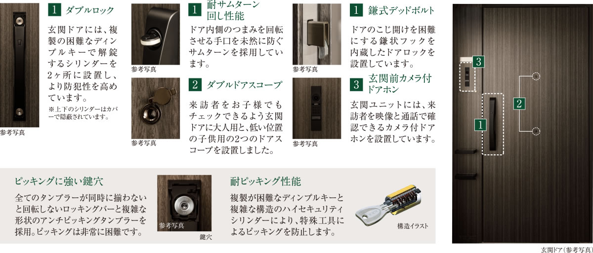 ピッキングやサムターン回しなど、さまざまな不正解錠を防ぐセキュリティ機能を玄関ドアに設けました。