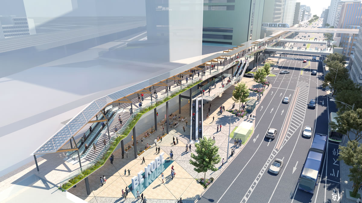 その神戸都心部で現在、大規模な再整備が進行中です。阪神・淡路大震災からの長い復興を経て、再び未来に向けたまちづくりに動き出した神戸市は、都心部の未来の姿を描いた「将来ビジョン」を2015年に発表。三宮駅から半径500mの範囲を「再整備基本構想」のエリアに定め、さらに2019年には神戸三宮「えき≈まち空間」基本計画を策定。都市の象徴として官民連携で取り組む新しい駅前空間のかたちが示されました。