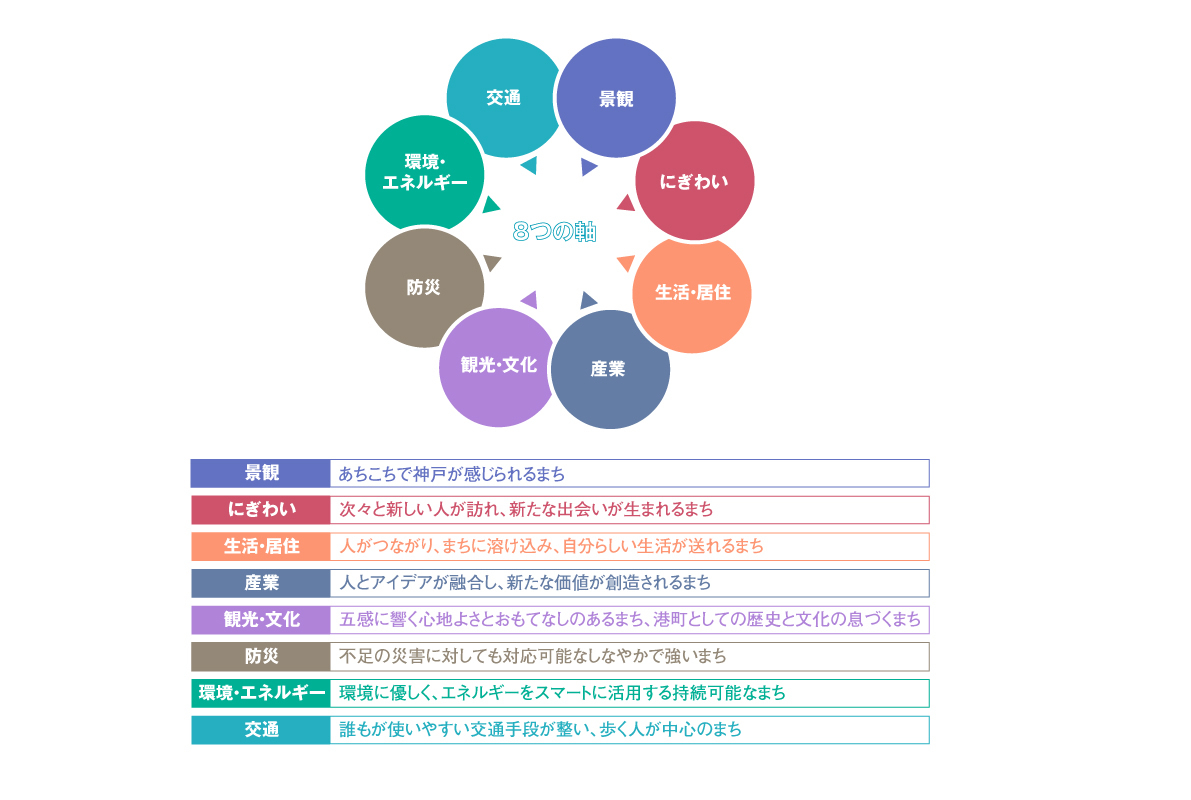 これらの再整備を中心に据えつつ、「景観」「にぎわい」「生活・居住」「産業」「観光・文化」「防災」「環境・ エネルギー」「交通」の8つを軸に、さまざまなプロジェクトが動き出しています。