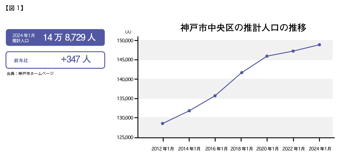 再整備に伴い、まちへの評価が高まっている中央区。現在、神戸市全体の人口は減少傾向にありますが、中央区においては人口増加が続いています【図1】。中央区には、商業施設や公共施設、交通機関が集積しており、こうした生活利便性の高さが人口流入の一因になっていると考えられます。