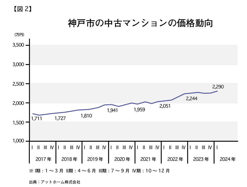 神戸市の中古マンション平均価格帯(2024年Ⅰ期)は、前年同期比2.0%アップの2,290万円。25期連続で上昇を続けており、神戸市における堅調な住宅需要がうかがえます【図2】。