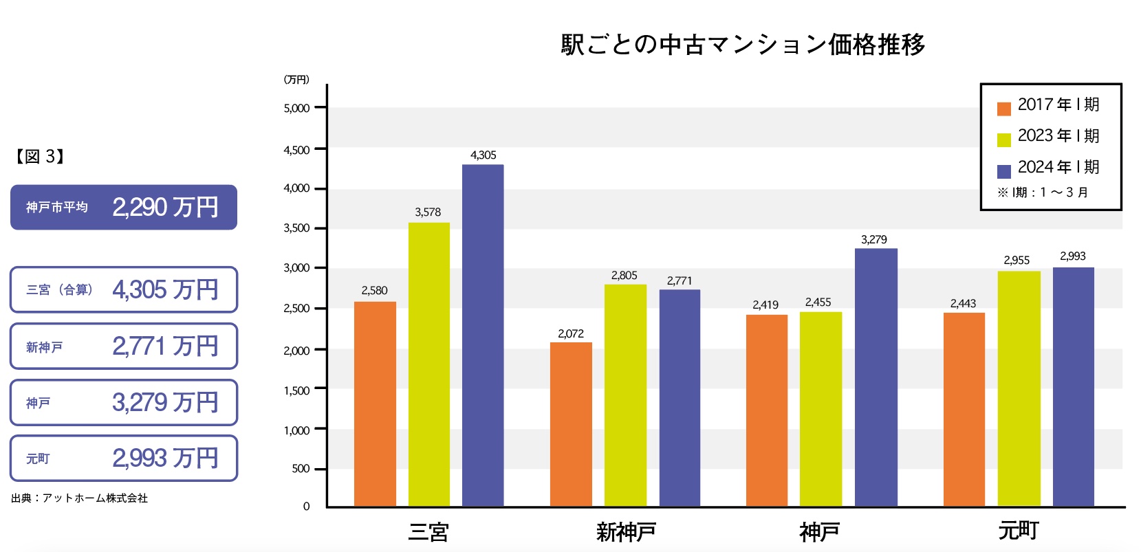 三宮、新神戸、神戸、元町の各駅周辺は、神戸市全体の平均を上回る価格水準となっており、商業の中心地である三宮が最も高額です。新神戸、神戸、元町は三宮と比べて割安となっていますが、これらのエリアは再整備が集中する三宮の恩恵を受けて、今後ますます需要が増えていく可能性があります。