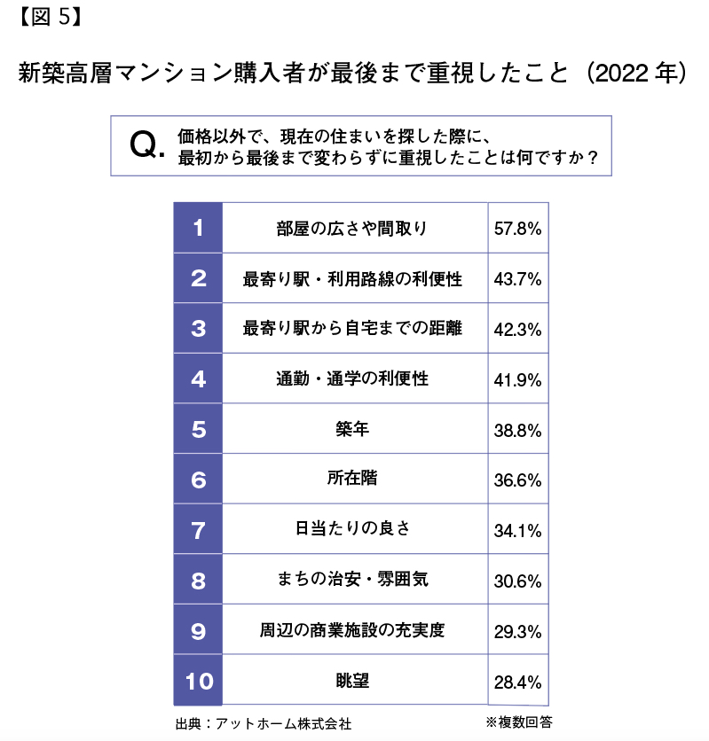 アットホームの調査「新築マンション購入者が最後まで重視したポイント」【図5】でも、「最寄り駅・利用路線の利便性」「通勤・通学の利便性」と併せて、「日当たりの良さ」「眺望」といった立地条件が特に重視されていることが分かります。これらの条件を満たすことで、満足度の高い住まい選びができ、将来的にも好条件での売却や賃貸活用が期待できるでしょう。