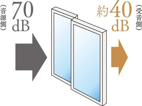 サッシは、音域500Hzの音を約30デシベル下げる性能を有する防音サッシT-2(30等級)相当を採用。外部からの音の侵入を軽減します。※サッシ性能試験においての数値。諸条件により誤差が生じます。
