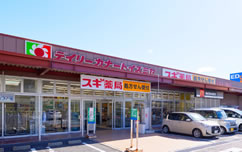 食品や日用品の買い物に便利。敷地内にスギ薬局が併設。