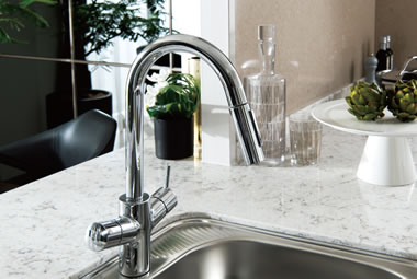 スタイリッシュなフォルムと高い浄水能力を兼ね備えた水栓。レバーで水・お湯を手軽に切り替えることができ、ハンドシャワー機能も備えています。