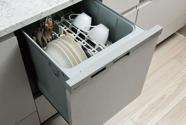 上から楽な姿勢で食器を出し入れできる、スライドオープンタイプの食器洗い乾燥機。低騒音化と省エネを実現しています。