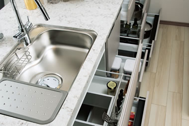 奥の物まで見やすく、取り出しやすいスライド収納。やさしく閉まるソフトクロージング機能付※1です。※1:スパイスラックは除く。※タイプにより仕様が異なります。