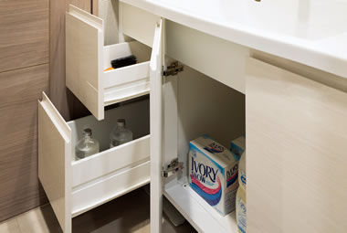 コスメ用品や洗剤などを機能的に整理できるフロアキャビネットは開き扉と引出しを2段ご用意しています。
