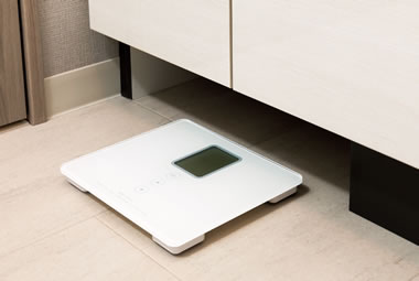 使用する時だけ出して普段は中に入れておけるヘルスメーター収納スペースを設けています。※ヘルスメーターのサイズには制限があります。