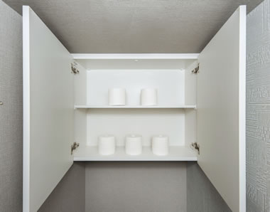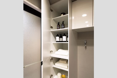 タオル類の整理や水まわり用品のストックなどに便利な収納を設置しました。※タイプにより仕様が異なります。