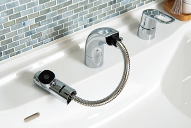 整流とシャワーの切り替えができるハンドシャワー水栓。ホースを引き出せるのでお掃除にも便利です。※タイプ部分はオプション仕様です。