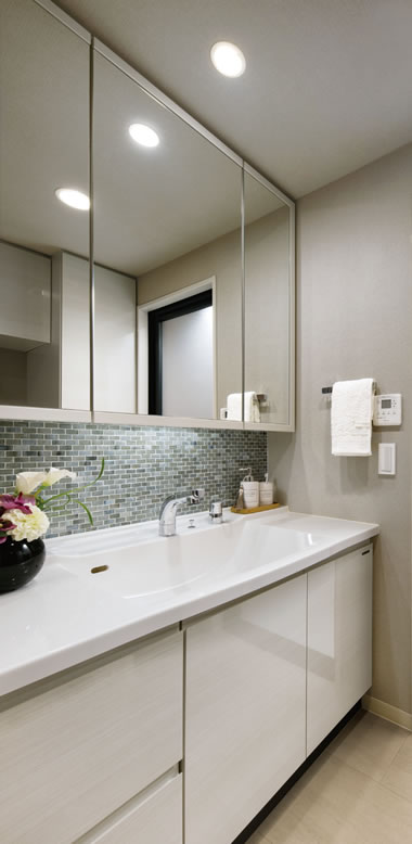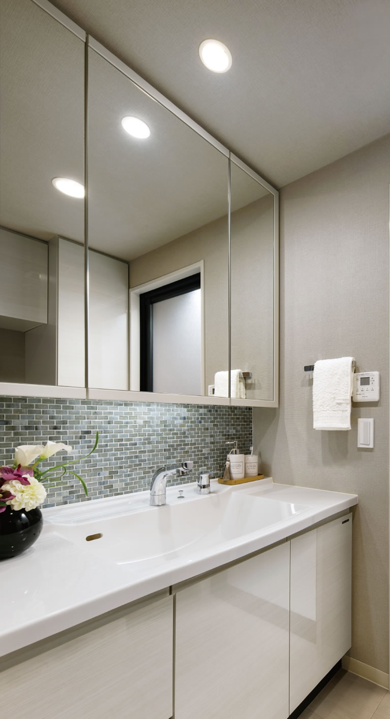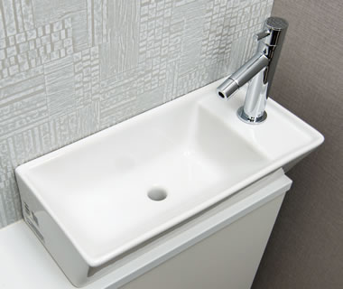専用の手洗い器は、スタイリッシュなデザインかつ省スペース設計。下部にキャビネットを設置しています。※タイプにより仕様が異なります。