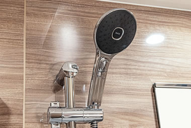 直径11cmのシャワーヘッドは手元で止水・吐水を操作できるので節水効果が高く、省エネにも有効。高さが調節できるスライドバー付です。